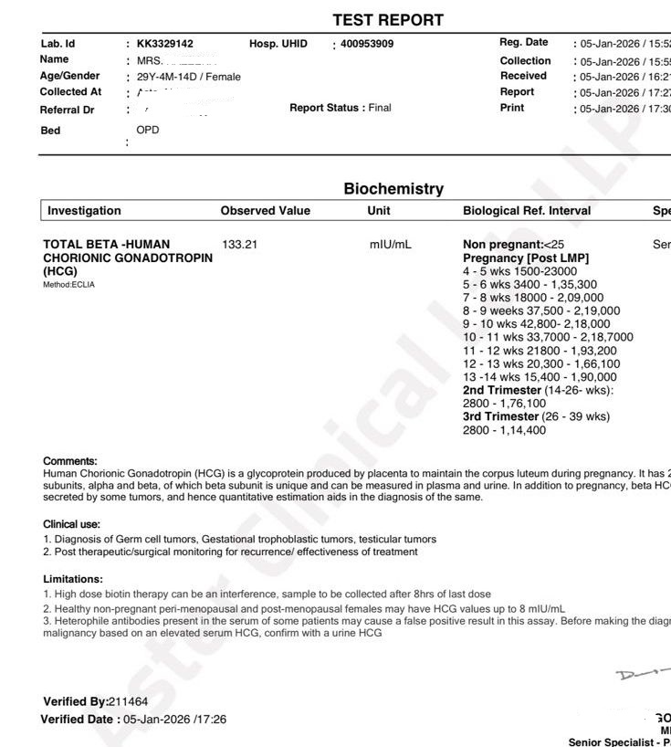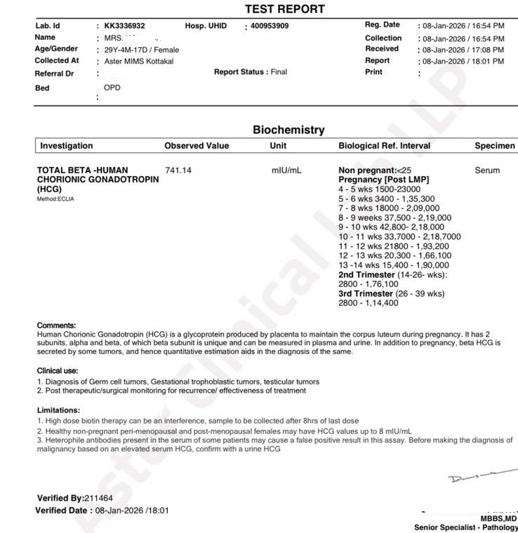 After 5 years of marriage, and despite a history that strongly favoured IVF, the patient conceived naturally. Early pregnancy was confirmed through: